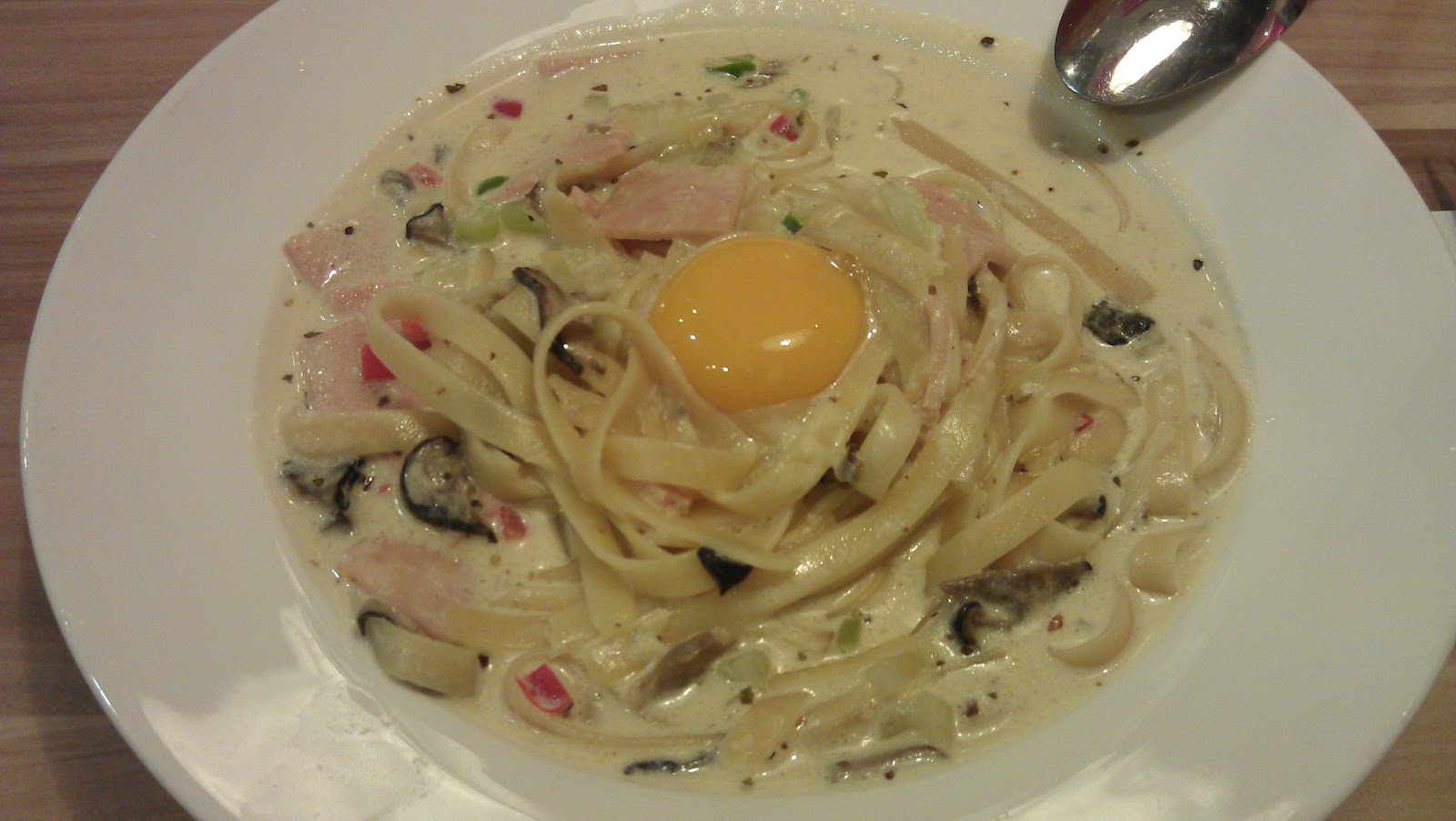 Carbonara with mushrooms, chicken ham, celery, green pepper and egg on the top.